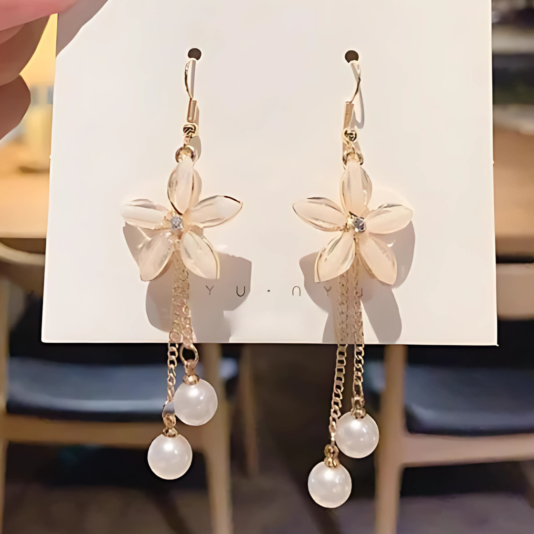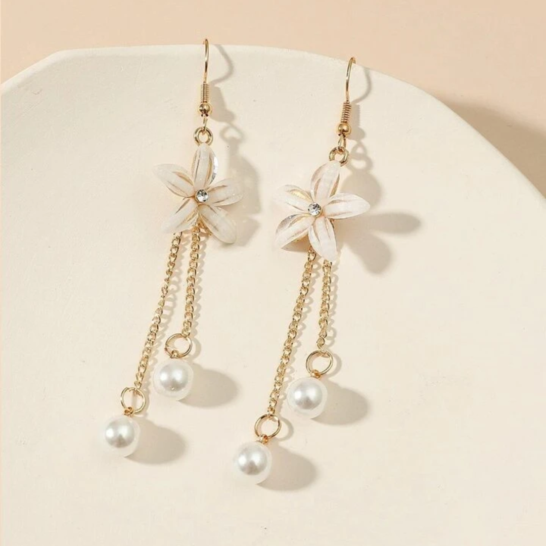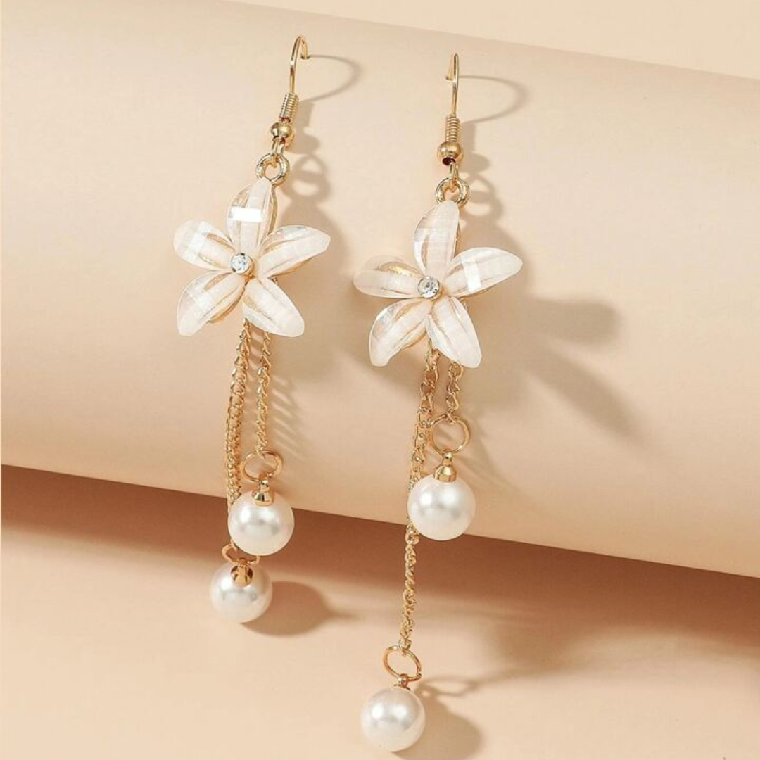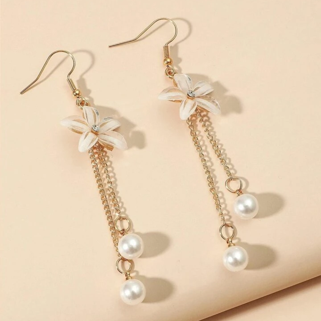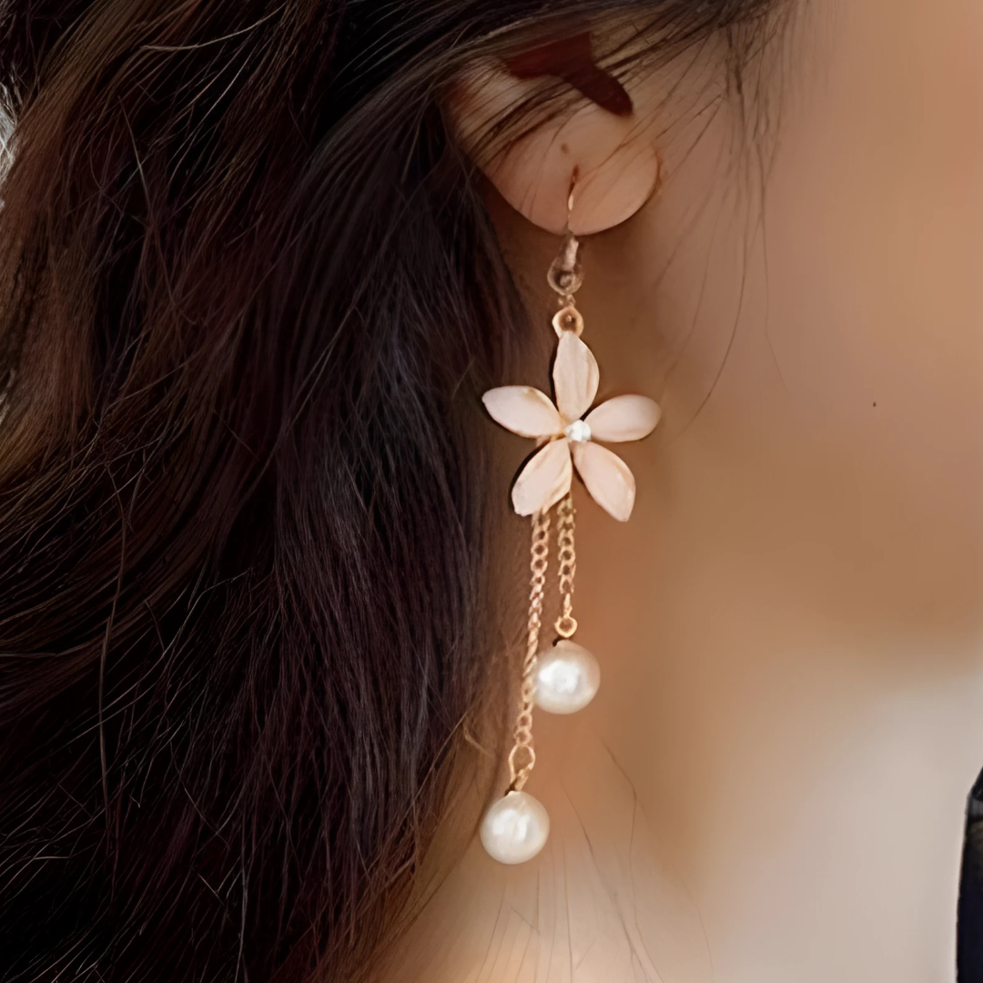 Disse charmerende dråbeøreringe har et delikat blomsterdesign kombineret med kaskadeperler, der giver et yndefuldt og feminint look. Kombinationen af guldfarvede kæder, blomsterdetaljer og perledråber skaber en blød, romantisk stil, der er perfekt til både hverdagsbrug og særlige lejligheder. De er lette, men iøjnefaldende og tilfører elegance og bevægelse til ethvert outfit.