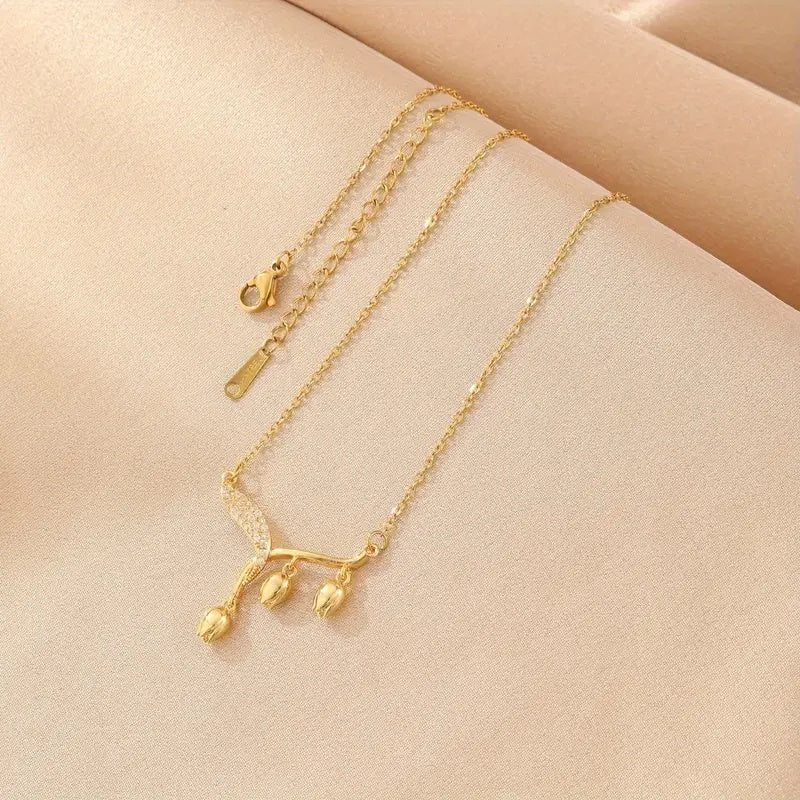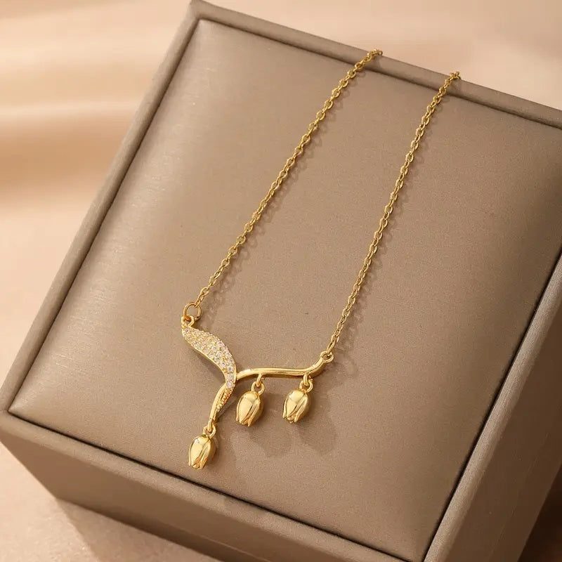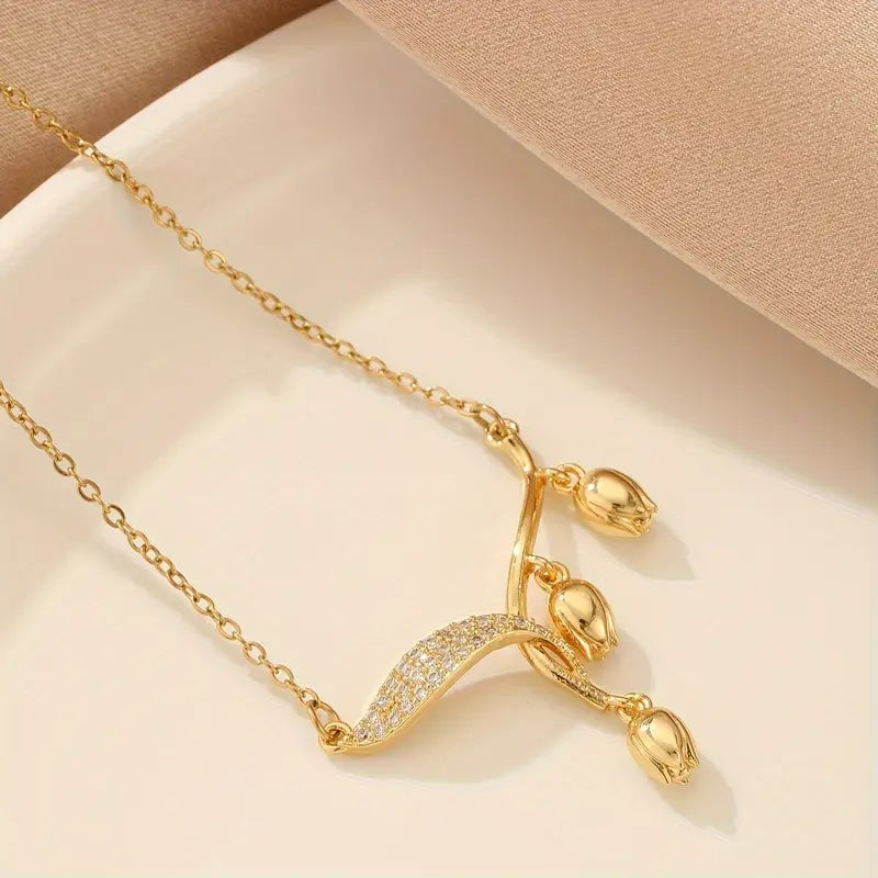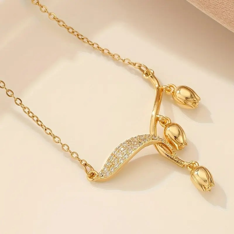 Halskæden består af en fin guldkæde, der elegant fører til et buet vedhæng. Vedhænget er prydet med skinnende zirkoniasten, der fanger lyset og tilfører et strejf af luksus. Fra vedhængets let snoede gren hænger tre delikate, tulipanformede vedhæng, som tilfører et blødt og feminint touch.